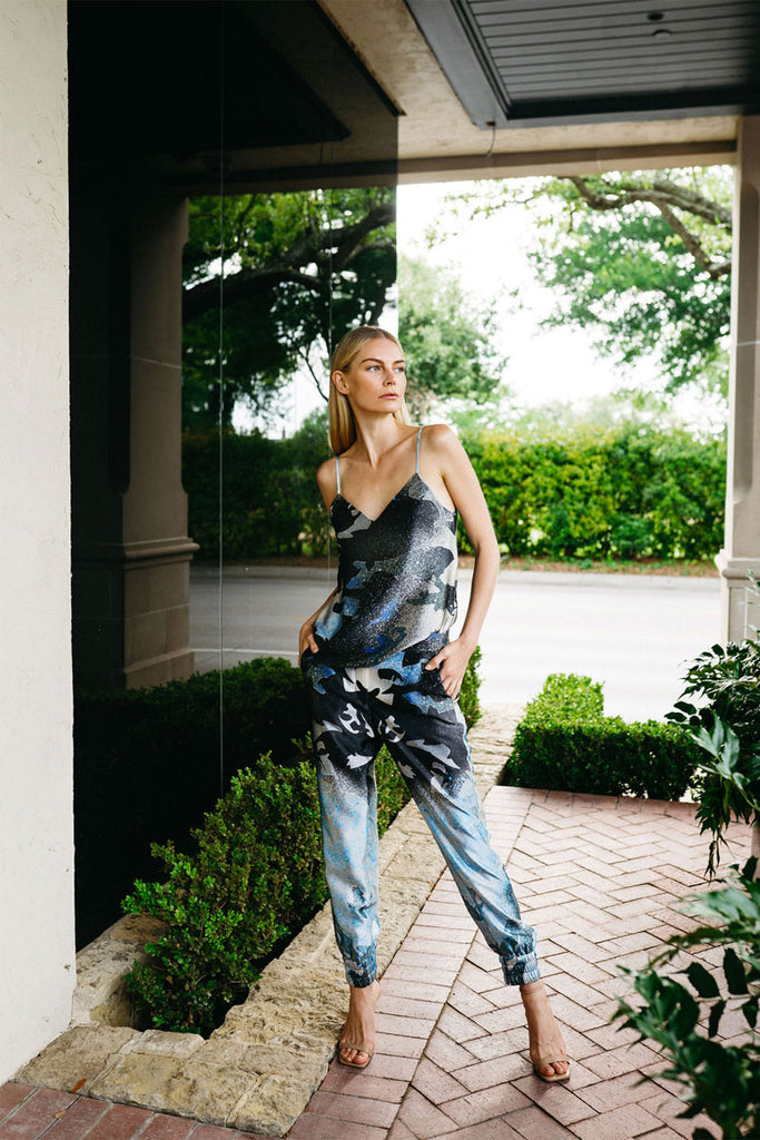 SALE: Camie is simply a timeless wardrobe staple, a v-neck camisole featured in the limited-edition Blue Inferno silk charmeuse print with thin straps and an inside facing on the neckline to create an extra layer across the chest—a perfect understated layering piece. Coordinates under any jacket, or for warmer days Camie will easily stand alone as a simple, understated camisole for any occasion. Sale: 50% off - use SALE25 at checkout.