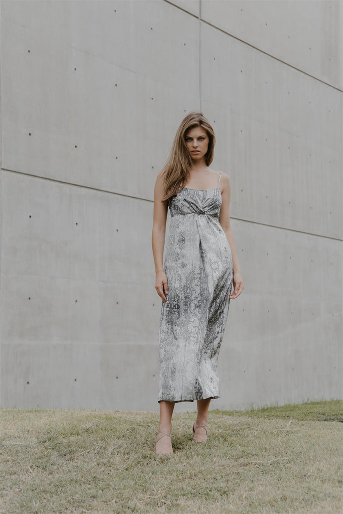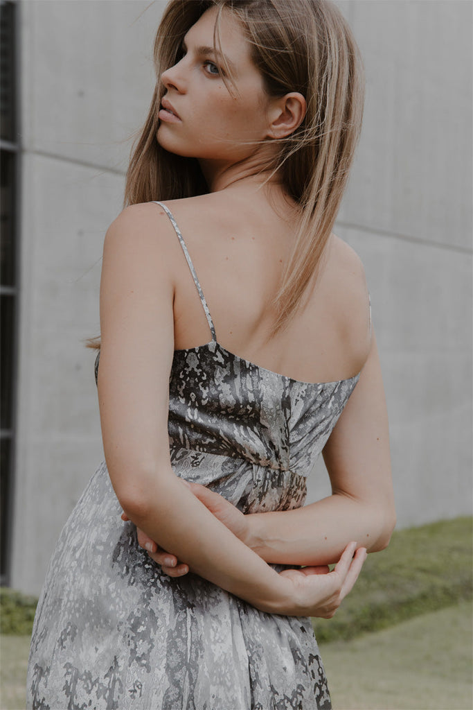 A simple silk-charmeuse dress with twisted pleats on the front and back empire line allowing for a flattering and elongated silhouette. With camisole-style straps, a side-zip opening, the full-length dress is fully lined in silk habotai with a long split at the back for a sneak peek of legs. Available in the silver Respair print, and style with the kimono coat, Chiyo, in nickel. TAKE 50% OFF, ENTER CODE: SALE25.