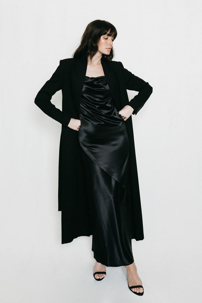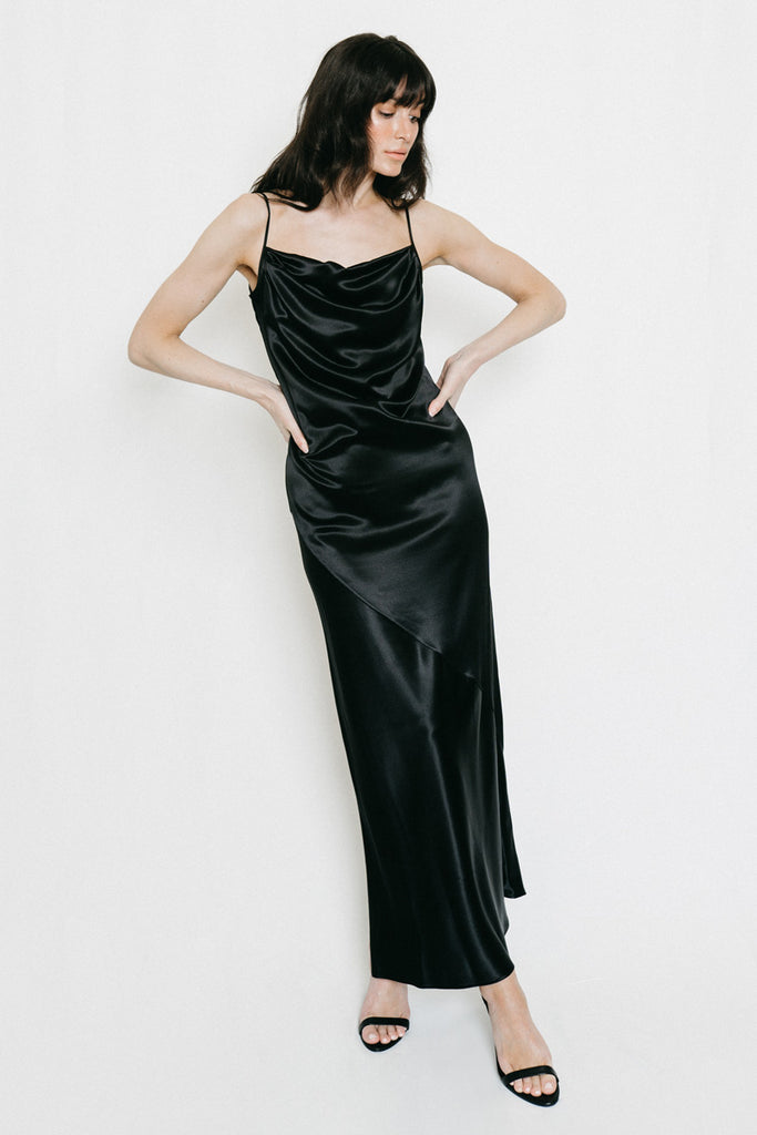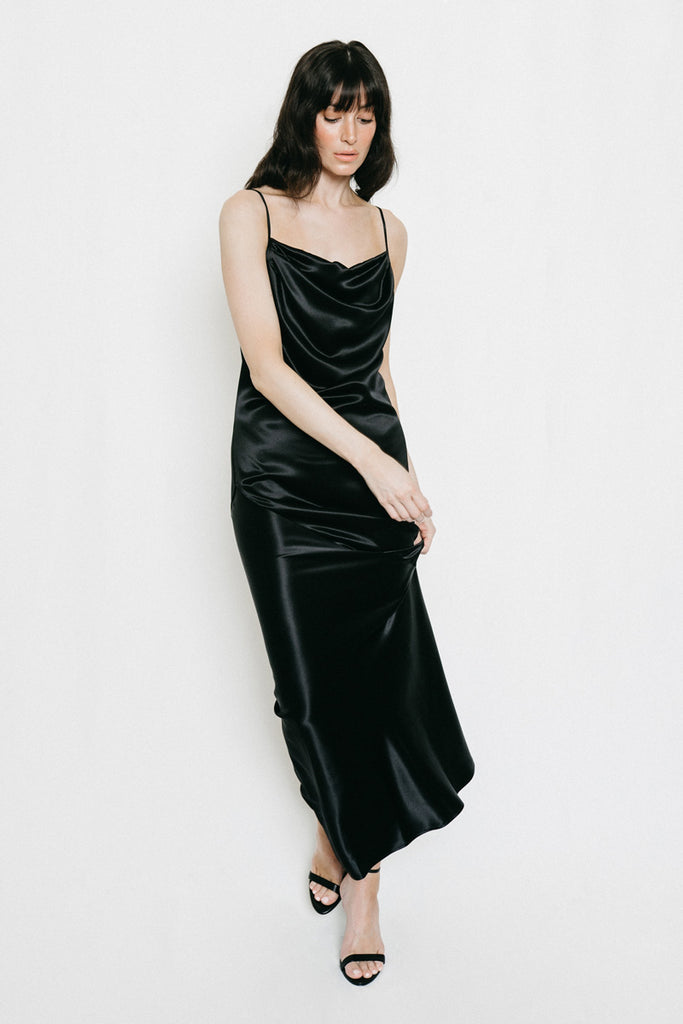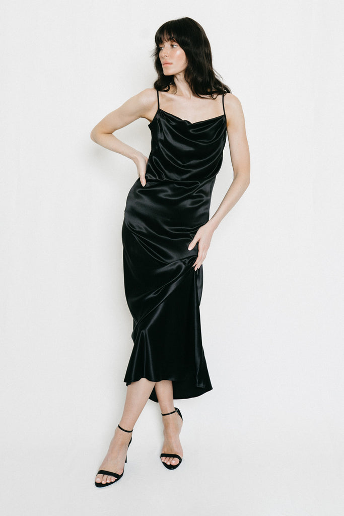 Meet Chloe, styled from our Grace camisole top. The bias-cut dress in silk satin back crepe slips on effortlessly, skimming the body with a relaxed fit. With a high back and drape neckline, Chloe can be worn with or without an undergarment. No lining, with the crepe side on the outside and the satin side on the inside for a luxurious feel. The black style features the satin side on the outside for evening glam. Chloe styles well with flat sandals, creating a day-to-evening look, or add heels for an elegant cocktail dress occasion.